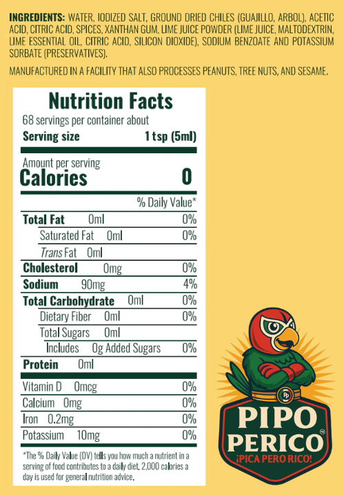 Pipo Perico is a mild hot sauce, made with guajillo and arbol chiles, fresh lime juice, and traditional spices. It’s crafted to bring authentic Mexican flavor without being overly spicy.